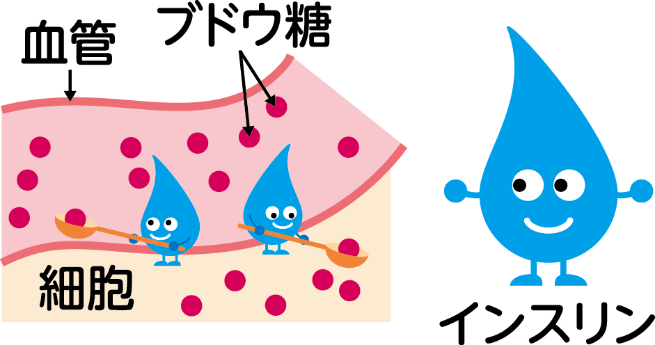 すい臓から分泌されているホルモン「インスリン」の分泌が少なくなっていたり、働きや効きが不十分であると、食後の血糖値が急上昇しやすく、また常に血糖値が高い状態となります。